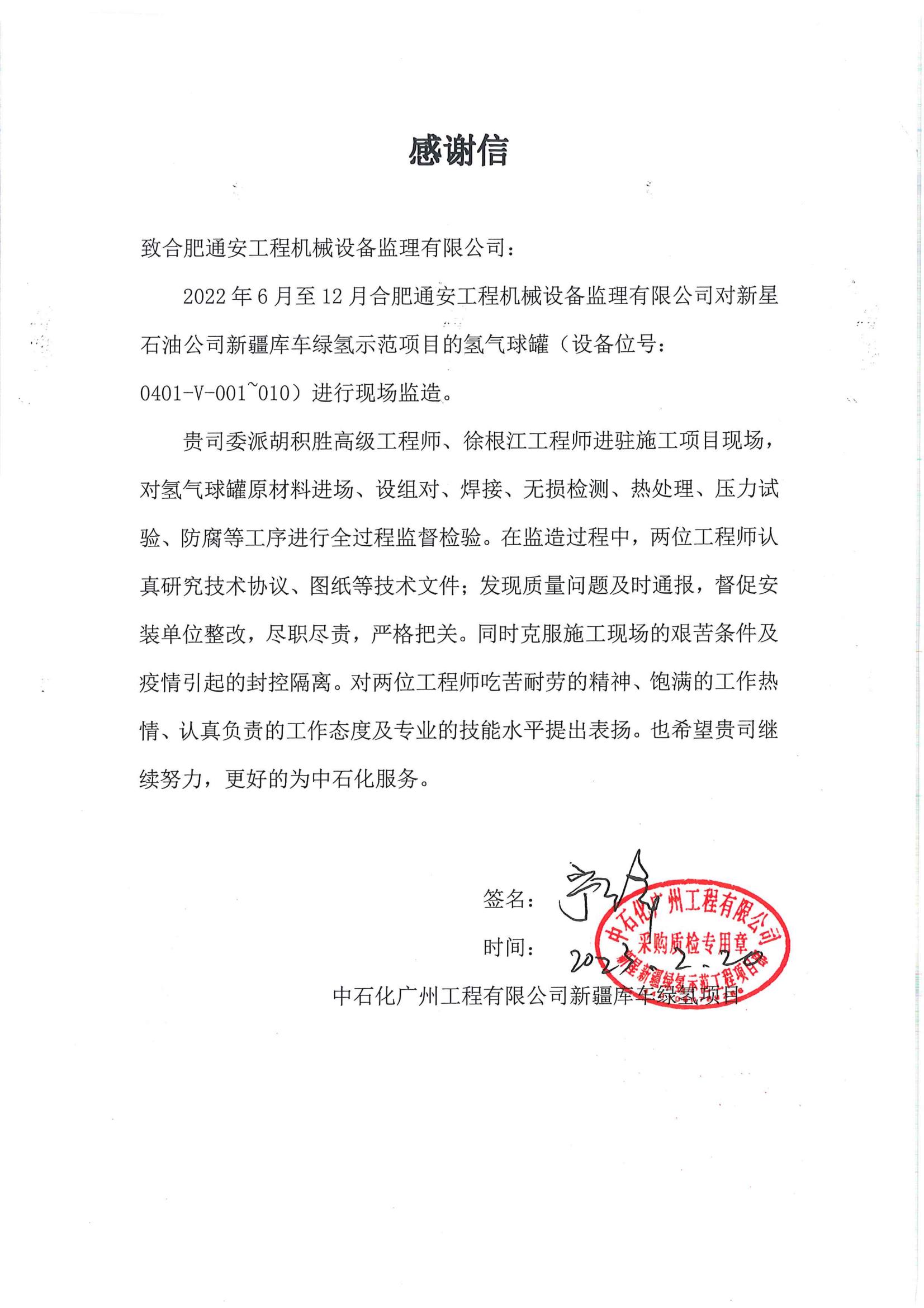 洛陽院新疆庫車綠氫示范項(xiàng)目儲氫球罐現(xiàn)場監(jiān)造表揚(yáng)信
