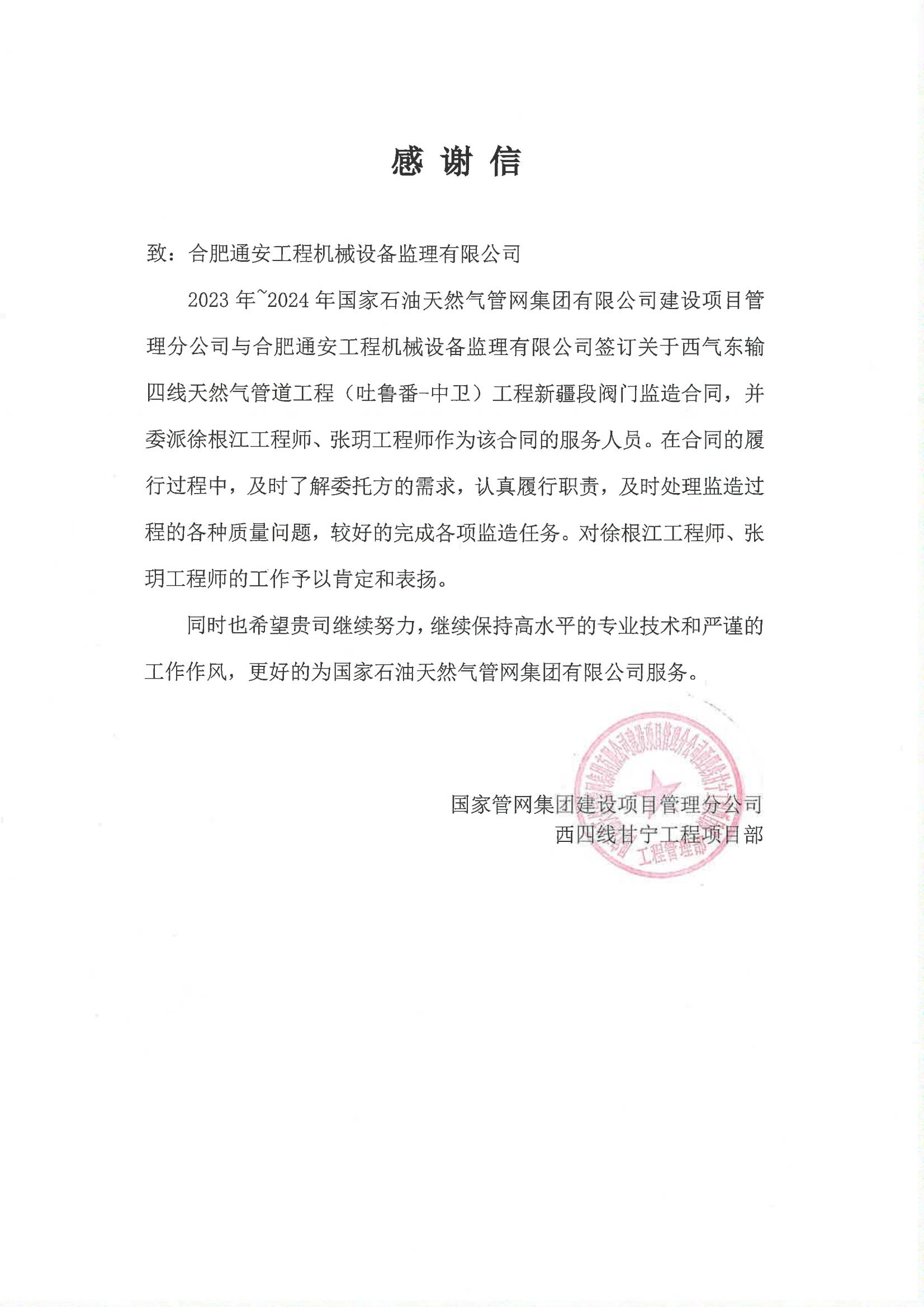 國家管網(wǎng)西四線新疆段感謝信
