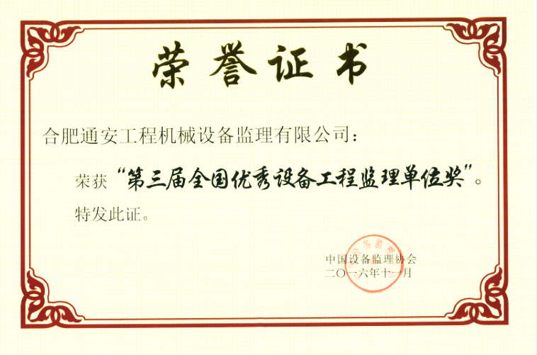 2016年11月2日,中國設(shè)備監(jiān)理協(xié)會三屆七次常務(wù)理事會在北京召開,會上宣讀了關(guān)于表彰第三屆全國優(yōu)秀設(shè)備工程監(jiān)理單位的決定,我公司繼獲得首屆、第二屆“全國優(yōu)秀設(shè)備工程監(jiān)理單位”后,再次獲此殊榮。